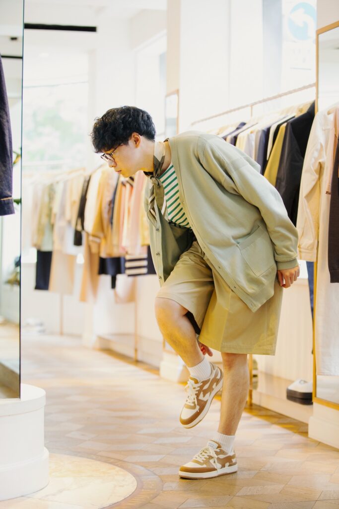 momo:ボーイッシュなスタイルが魅力のイラストレーター/在住:兵庫県/身長:154cm/職業:イラストレーター/得意なコーディネート:古着、スニーカー、チノパン、ポロシャツ、メガネ